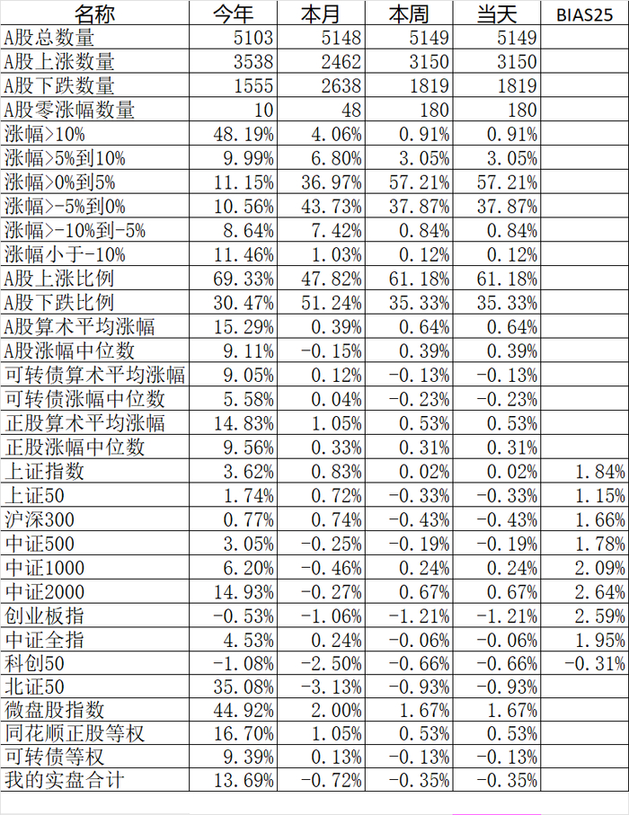 469只可转债平均跌0.13%,对应正股平均涨0.53%。我的主仓20只可转债平均跌0.37%,对应正股平均跌0.15%。今天卖出弘亚转债买入隆华转债,账户合计实际下跌0.35%。