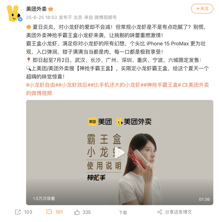 美团外卖在6月30日上线的新广告,将一盒小龙虾用超现实的方式“放大”:不仅在视觉呈现上大胆夸张,更在叙事方式上玩转“工具化类比”梗。借助社交媒体的病毒传播效应,小龙虾的“可食性”瞬间被转译为“存在感”。
