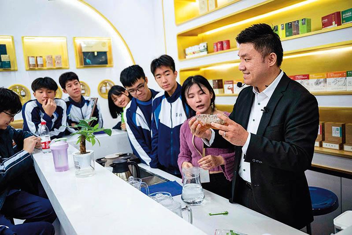 澳门居民黄滋才(右一)在位于横琴的分子态(珠海横琴)中医药健康产业发展有限公司的植物(现代中药)分子博物馆内与澳门劳校中学的学生交流(2024 年 12 月 11 日摄) 新华社发(张金加摄)