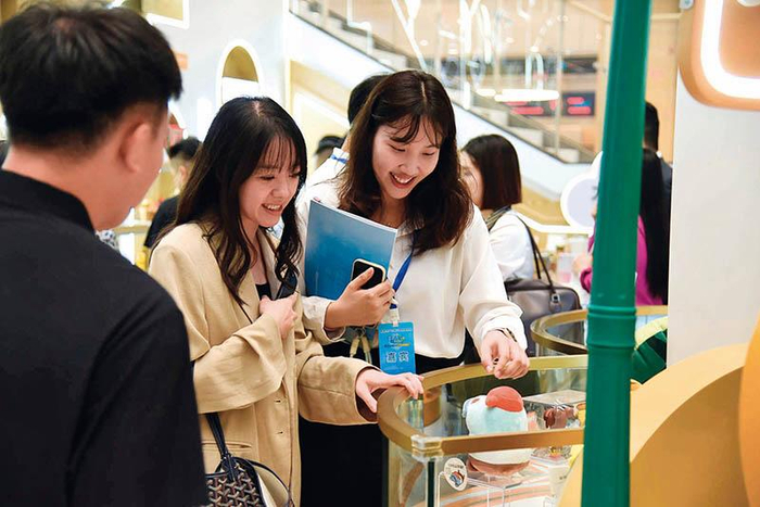 港澳青年在横琴政务服务中心的“澳品荟”横琴展示区浏览澳门创意产品(2024 年 9 月 23 日摄) 洪泽华摄 / 本刊