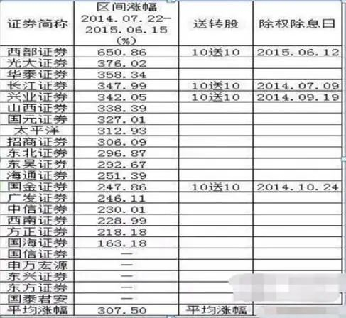 2015年的时候,很多券商股就从十几元上涨到了三四十元,收益方面都很高,最关键的是预期明确。券商股龙头西部证券从当时12元附近起步,涨到最高82元,收益达到583%。券商龙头中信证券涨幅巨大。