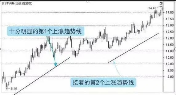 在整个股价上涨阶段,有两个十分明显的支撑线,这个支撑线又称为上涨趋势线,一旦确定了上涨趋势线就可以找到一只爆发的牛股。如下图