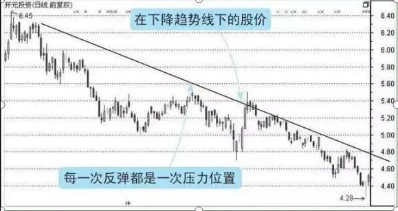 我们可以发现,一只熊股的股价总是被下降趋势线所压制住的。下降趋势线也是由一根下降的直线组成的,虽然也很简单,但容易判断失误,因为下降趋势到底有多长,这个是一个难点,而如何确认下降趋势只是次要的难点。通常而言,我们对下降趋势线有如下的认识。
