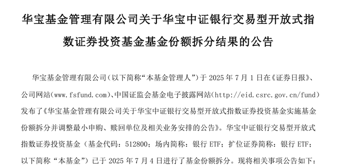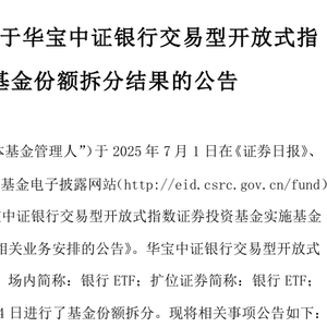 7月7日,华宝基金公告,旗下规模居首的银行ETF(512800)正式实施1:2份额拆分,基金总资产规模保持不变。此次拆分后,投资者场内交易门槛显著降低,基金流动性有望进一步提升。