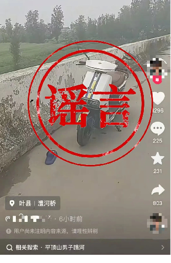 真相:6月26日,平顶山叶县县委网信办巡查发现,某平台账号发布一则视频称“叶县刚刚有人跳桥”,引起网民关注评论。网信部门将该线索移交公安部门,进行协同调查。经查,康某为博眼球、蹭流量,将电动车和拖鞋摆放在桥沿进行摆拍,捏造“有人跳河”虚假事件,并制作成短视频发布,故意制造恐慌,该视频系不实信息。公安部门依法对康某予以行政处罚。(来源:平顶山市委网信办)