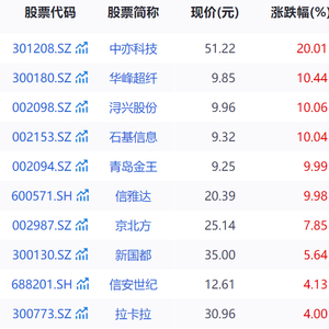 今日,A股方面,截至14时30分,中亦科技20cm涨停,华峰超纤涨超10%,浔兴股份、石基信息、青岛金王、信雅达等涨停,京北方、新国都、信安世纪等涨幅居前。