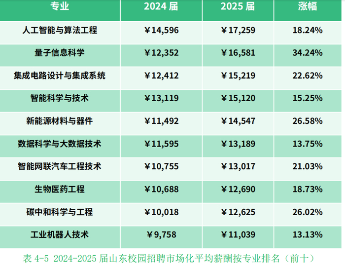 山东在战略新兴产业上的竞跑速度,充分释放在2025年山东应届大学毕业生就业市场上。近日出炉的齐鲁人才《山东2025届校招报告》显示,2025年山东校招市场需求上,新能源行业岗位需求增幅34.85%!半导体/集成电路行业岗位需求增幅27.48%!人工智能岗位需求增幅21.43%!AI大模型应用正在渗透到各个行业,人工智能领域的人才竞争白热化,算法工程师以19785元月薪位居TOP10高薪榜岗位榜首。在薪资涨幅最高专业中,量子信息科学以高达34.24%的涨幅位居。