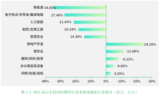 近日,山东最大区域性招聘平台齐鲁人才发布了《山东2025届校招报告》。从行业需求来看,新能源、电子技术/半导体/集成电路、人工智能等新兴领域招聘需求大幅增长,其中新能源行业同比涨幅高达34.85%,电子技术/半导体/集成电路和人工智能行业分别增长27.48%和21.43%,展现出强劲发展势头。相比之下,传统行业普遍收缩,房地产开发行业校招需求暴跌24.29%,餐饮、服饰、纺织、皮革等行业呈现不同程度负增长。