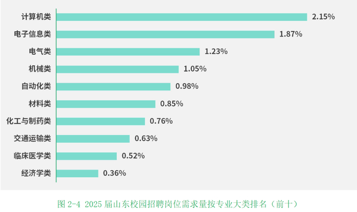 从专业需求量来看,理工科专业在就业市场中占据绝对主导地位。2025山东校招岗位需求量按专业排名TOP10中,计算机类以2.15%的占比高居榜首,达到电子信息类的1.15倍,充分体现IT人才的市场价值。机械、自动化、材料、化工与制药等传统工科专业的需求量依然可观,凸显传统制造业在山东经济中基础性地位。