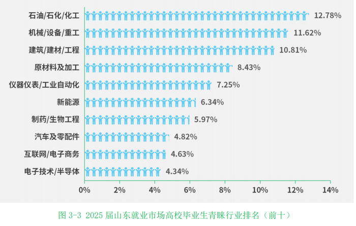 从2025年山东高校毕业生青睐的行业TOP10中,传统制造业以压倒性优势稳居基本盘,其中石油/石化/化工(12.78%)、机械/设备/重工(11.62%)、建筑/建材/工程(10.81%)三大领域占比 35.21%。这一格局凸显了山东作为实体经济大省的产业根基——万华化学、潍柴动力、海尔等龙头企业构建的庞大产业链,持续吸纳了大量工程技术、生产管理类人才。