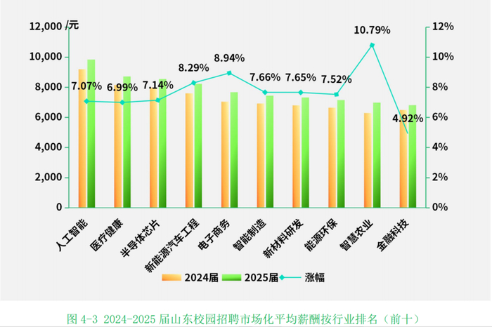 行业薪酬分化趋势为毕业生提供了明确指引。人工智能、医疗健康领跑行业薪酬赛道,从薪资涨幅来看,智慧农业贡献了 10.79%的最大涨幅。