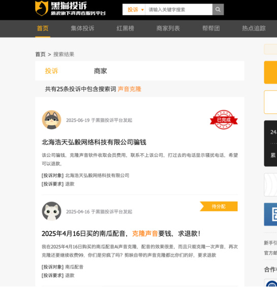 不过,在众多此类工具中,也不乏有用户使用后受骗的例子。记者在黑猫平台搜索“声音克隆”发现,有多名用户曾对此进行投诉。
