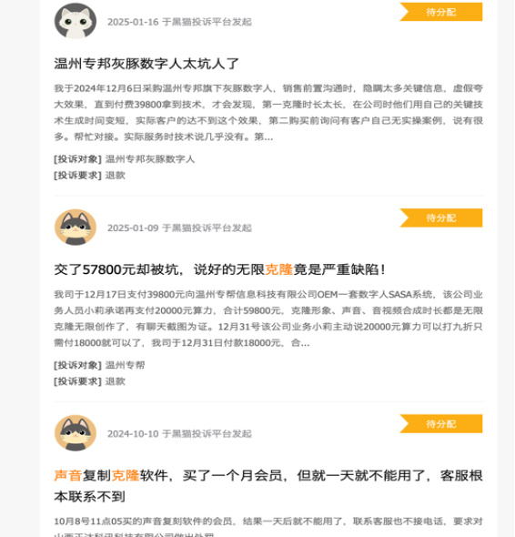 比如,有用户投诉称,克隆的声音效果差,收费不合理;有人称买了一个月会员,但仅用了一天就不能用了,客服也联系补上;更有用户称,自己交了57800元却被坑,软件存在严重缺陷。