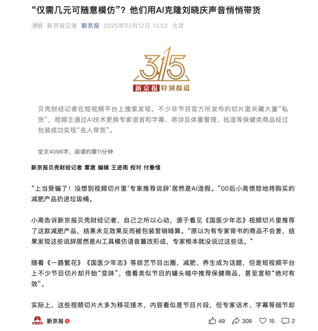 比如,新京报曾报道仅需几元可随意模仿明星声音,商家用AI克隆刘晓庆的声音悄悄带货。南方日报报道过全红婵及家人的声音被AI合成冒充带货,等等。
