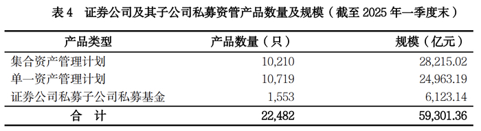 数据显示,截至一季度末,券商资管产品总量达22482只,总规模5.93万亿元,占资管市场总规模9.23%。从产品结构来看,集合资产管理计划以10210只的数量和2.82万亿元的规模,成为券商资管业务的主力军;定向资产管理计划(即单一资产管理计划)则以10719只的数量略占上风,规模达2.50万亿元;证券公司私募子公司私募基金虽数量仅有1553只,但也贡献了0.61万亿元的规模。
