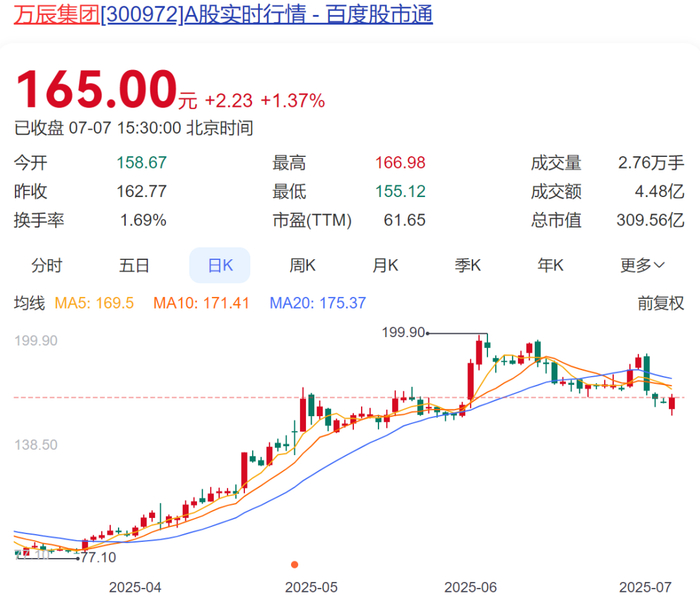 截至7月7日收盘,万辰集团股价上涨1.37%,报165元/股,总市值309.6亿元。今年来股价已实现翻倍。