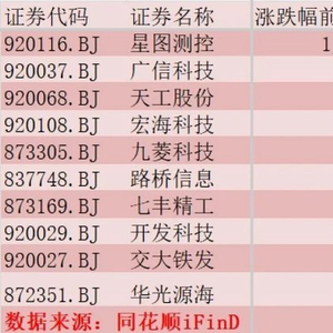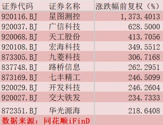 其中,星图测控(920116.BJ)成为十倍牛股,其股价涨幅达1373%,位居第一;广信科技(920037.BJ)涨幅为628.5%,位居第二;天工股份(920068.BJ)涨幅为413.7%,位居第三。
