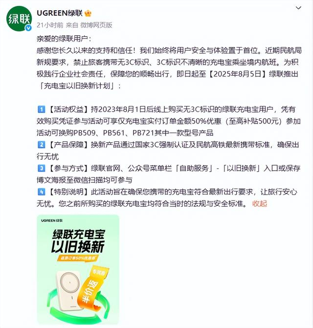 绿联:在售产品全面切换力神、长虹三杰等一线电芯,同时推出「绿联充电宝以旧换新」计划,针对2023年8月1日后线上购买的无3C认证标识绿联充电宝,符合相关要求可获得至高500元的换新补贴。