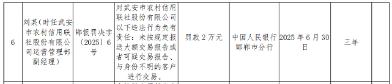 同时,杜某明(时任武安市农村信用联社股份有限公司副主任)对武安市农村信用联社股份有限公司以下违法行为负有责任:未按规定报送大额交易报告或者可疑交易报告、与身份不明的客户进行交易,被罚款2万元;刘某(时任武安市农村信用联社股份有限公司运营管理部副经理)对武安市农村信用联社股份有限公司以下违法行为负有责任:未按规定报送大额交易报告或者可疑交易报告、与身份不明的客户进行交易,被罚款2万元。