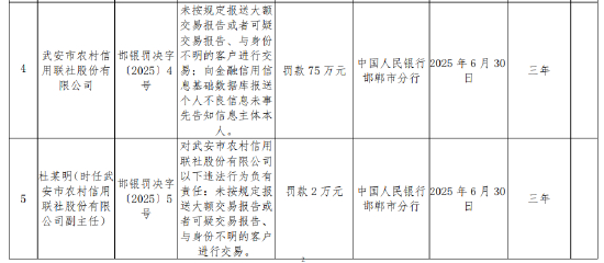 武安市农村信用联社被罚75万元:未按规定报送大额交易报告或者可疑交易报告等