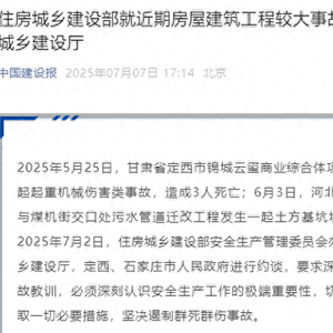 人民网石家庄7月7日电 (记者杨文娟)据中国建设报微信公众号7月7日消息,2025年5月25日,甘肃省定西市锦城云玺商业综合体项目(一期)A区5#楼发生一起起重机械伤害类事故,造成3人死亡;6月3日,河北省石家庄市长安区和平东路与煤机街交口处污水管道迁改工程发生一起土方基坑坍塌类事故,造成3人死亡。2025年7月2日,住房城乡建设部安全生产管理委员会办公室对甘肃、河北省住房城乡建设厅,定西、石家庄市人民政府进行约谈,要求深刻汲取“5·25”“6·3”较大事故教训,必须深刻认识安全生产工作的极端重要性,切实增强紧迫感与使命感,采取一切必要措施,坚决遏制群死群伤事故。
