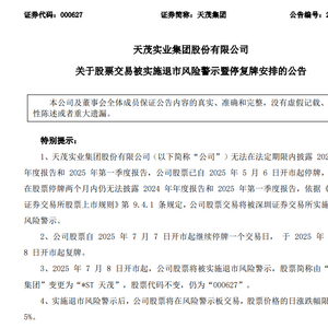 7月6日晚间,天茂集团发布公告称,公司股票自7月7日开市起继续停牌一个交易日,于7月8日开市起复牌并被实施退市风险警示,股票简称由“天茂集团”变更为“*ST天茂”。实施退市风险警示后,公司股票将在风险警示板交易,股票价格的日涨跌幅限制为5%。