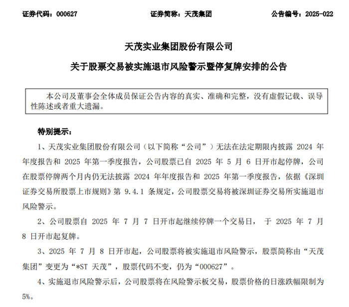 在股票停牌两个月内,天茂集团仍无法披露2024年年度报告和2025年第一季度报告,依据相关规定,公司股票交易将被深圳证券交易所实施退市风险警示。