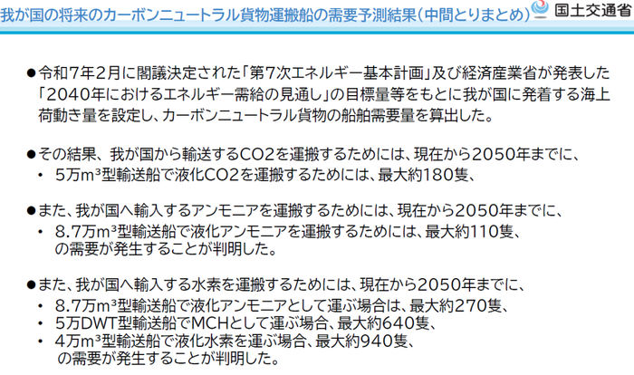 6月20日,日本国土交通省海事局为制定面向新兴需求的国内造船业发展愿景,正式发布《日本未来碳中和货物运输船舶需求预测(中期报告)》。研究聚焦碳中和目标下的海运需求,重点测算了氢能、氨能进口及二氧化碳出口等新兴货物至2050年的运输船舶需求量,结果显示相关船型市场将迎来显著增长,其中液化氢运输船的需求量或将高达940艘。