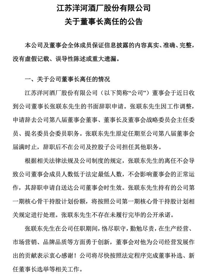 7月1日,洋河股份(股票代码:002304.SZ)突发公告,宣布董事长张联东提出书面辞职申请。公告表示:张联东因工作调整,申请辞去公司第八届董事会董事、董事长及董事会战略委员会主任委员、提名委员会委员职务。张联东原定任期至公司第八届董事会届满时止,辞职后不在公司及控股子公司担任其他职务。