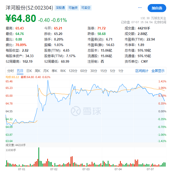 从股市表现来看,洋河股份今天(7月7日)高开低走,截至收盘每股报64.8元,总市值达976.18亿元。
