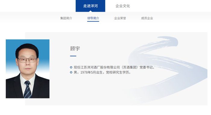 同日晚间,洋河股份官网“领导简介”一栏更新。现任宿迁市宿城区区长的顾宇,出任江苏洋河酒厂股份有限公司(苏酒集团)党委书记一职。