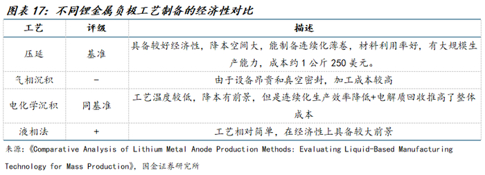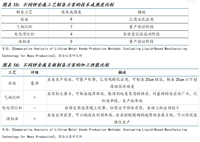 1)技术程度上看,压延法>气相沉积法>液相法>电化学沉积。比较来看,压延法当前已经在固态电池领域得到了商业化应用,其成熟度最高;气相沉积法、液相法均处于量产验证阶段;电化学沉积处在实验室实验成功阶段。