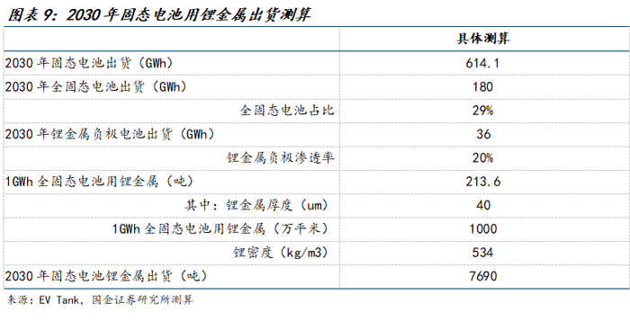 我们测算2030年固态电池用锂金属约7700吨,市场百亿。根据EVTank,2024年全球固态电池出货量达到5.3GWh,同比大幅增长4.3倍,全部为半固态电池,主要为中国企业生产。EV Tank预计全固态电池将在2027年实现小规模量产,到2030年将实现较大规模的出货。《中国固态电池行业发展白皮书(2025年)》预计到2030年全球固态电池出货量将达到614.1GWh,其中全固态的比例将接近30%。我们假设2030年全固态电池出货180GWh,锂金属负极假设渗透率20%,测算得36GWh。假设采用双面20um锂箔,合计40um厚度,1GWh电池用量1000万平,结合锂的密度534kg/m3,则对应1GWh电池用锂金属(不考虑铜箔)约214吨,18GWh对应用量约7700吨,假设120万元/吨,对应市场92亿元。