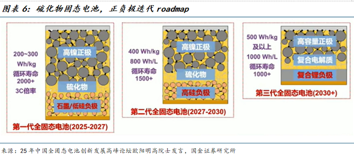 低硅→高硅→锂金属,负极发展路径清晰。根据欧阳明高院士,当前已行成已硫化物路线为主体的固态电池发展路线,根据正负极侧的迭代,具体的roadmap表现为:
