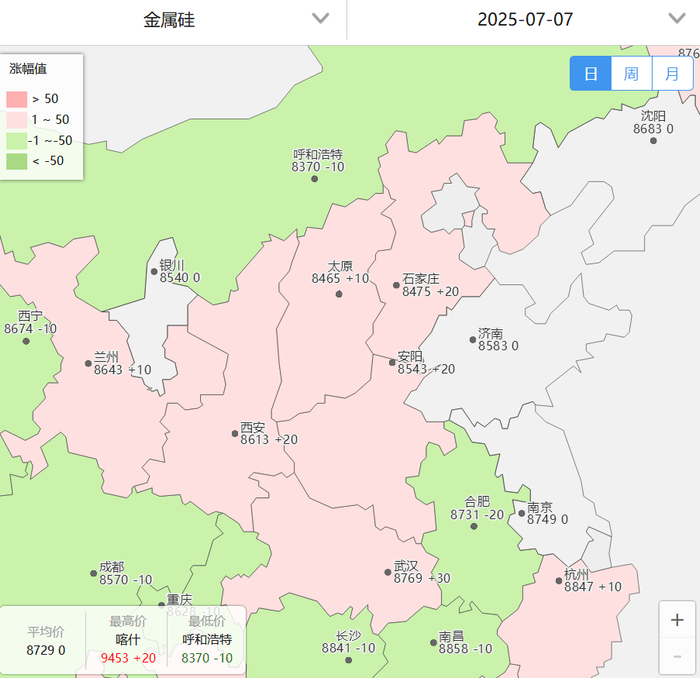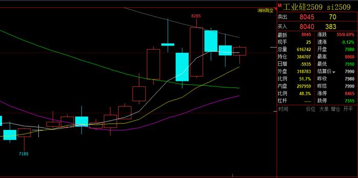 周初复市,工业硅期货行情小幅翻红,盘面价格稍有走高!7月7日,截止15:00收盘,工业硅主力合约2509收盘翻红运行,开盘7980,收盘上调55至8045,涨幅0.69%,收盘价格相较上一交易日上调65。另,主力合约当日成交总量为616743手,持仓量384707手,当前总持仓量633349手,具体如下图所示:
