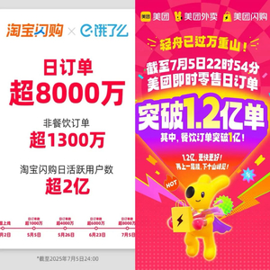 近日,淘宝闪购和饿了么联合宣布:7月5日的日订单数超8000万,非餐饮订单超1300万,淘宝闪购日活跃用户超过2亿。