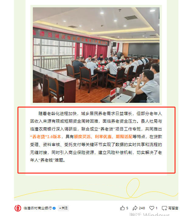 6月9日,临澧农商银行官微称,这是“县人社局与临澧农商银行深入调研后,联合成立“养老贷”项目工作专班,共同推出“养老贷”2.0版本”。