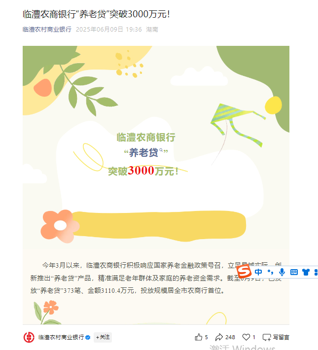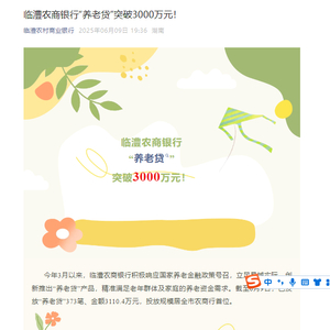 其中,临澧农商银行宣布,截至6月9日“养老贷”余额已经突破3000万元。