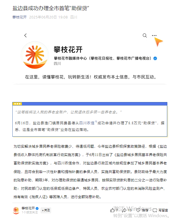 6月20日,四川攀枝花融媒体中心官微信息显示,辖内盐边县6月11日出台了《盐边县城乡居民基本养老保险共富助保贷款实施方案》,与四川农信合作,对盐边县行政区域内按规定参加了城乡居民基本养老保险,且符合到龄一次性补费和提档补费的参保人员,实施共富助保贷款。县财政给予最大力度的贴息补助,期限3年,对办理助保贷的普通城乡居民,按照实际贷款利息的二分之一进行贴息补助。