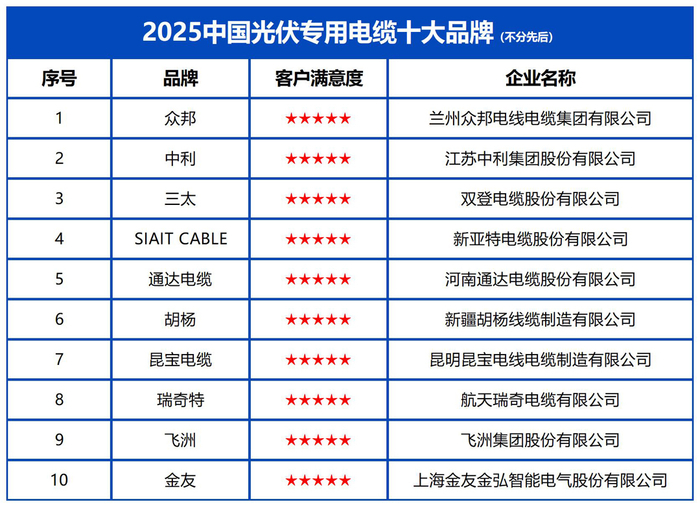 在“双碳”目标和新型电力系统建设的双重驱动下,光伏电缆行业正迎来前所未有的发展机遇。近日,招投标供应链品牌推介平台正式发布“2025中国光伏专用电缆十大品牌”榜单,通过科学严谨的评价,众邦、中利、三太、SIAIT CABLE、通达电缆、胡杨、昆宝电缆、瑞奇特、飞洲、金友等品牌凭借领先的产品性能、深厚的技术积累与突出的市场表现为行业树立了高质量发展的新标杆。