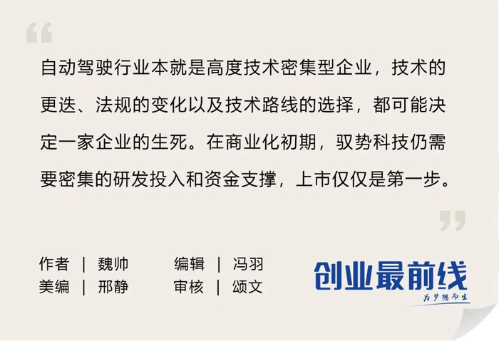 自动驾驶行业本就是高度技术密集型企业,技术的更迭、法规的变化以及技术路线的选择,都可能决定一家企业的生死。在商业化初期,驭势科技仍需要密集的研发投入和资金支撑,上市仅仅是第一步。