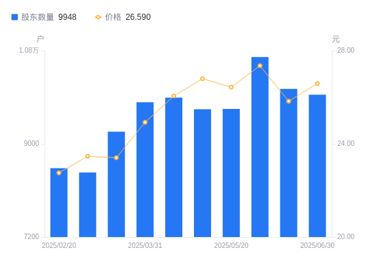 近一年(2024年6月30日至2025年6月30日),凯因科技A股股东户数从7078户,增加至9948户,增幅40.55%,区间股价上涨5.45%。