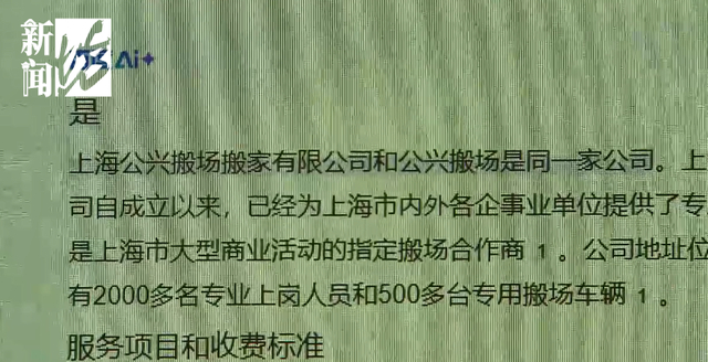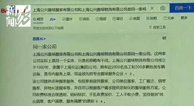 记者再次在百度上搜索公兴搬家或公兴搬场,跳出了不少名字含有"公兴"的搬家公司,由于搜索结果众多,记者以消费者的身份,向百度AI提问:"上海公兴搬场搬家有限公司是公兴搬场吗?",回答为"是"。