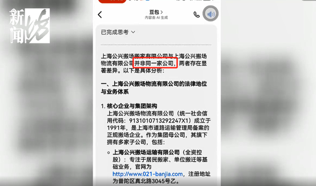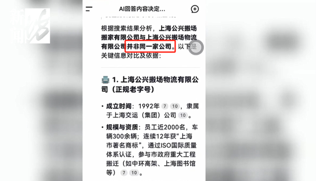 百度在大众认知里是搜索引擎,如今也有提供AI服务。记者向百度的AI提问:上海公兴搬场搬家有限公司,和上海公兴搬场物流有限公司是同一家吗?得到的回复是肯定的。
