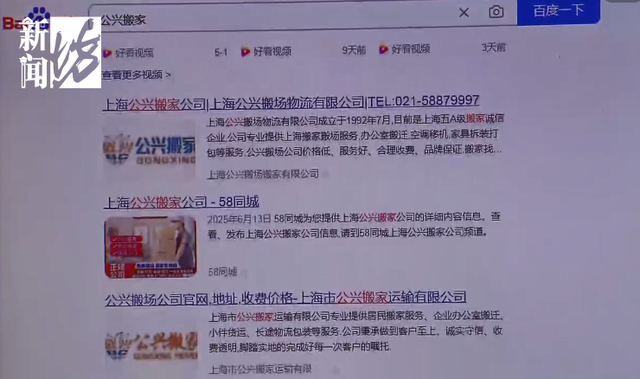 市民王女士说,她在"百度"搜索平台,寻找"公兴"搬场,发现有多个搜索结果。为了排除李鬼网站,她还特地找了排名靠前、有车辆照片、品牌标识、介绍等,看上去挺正规的网站。