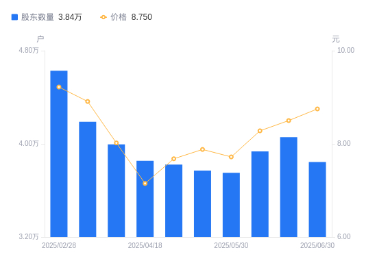 7月4日消息,数据显示,截至2025年6月30日,华自科技A股股东总户数为3.84万户,较上期(2025年6月20日)减少2124户,降幅5.24%。公司最新A股总股本为3.99亿股,其中流通A股3.93亿股,户均持有流通A股数量为1.02万股,较上期增加535.49股,增幅5.52%;户均持流通A股市值8.95万元,较上期增加7108.74元,增幅8.63%。