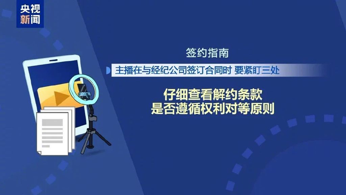 郭栋佳:比如迟播几分钟扣多少钱,直播要符合平台的哪些规定,直播时出现哪些不规范用语、行为会构成违约,这些主要的违约情形,应当明确告知主播。特别要关注“等等”“类似”这种模糊的文字表述,它可能暗藏套路陷阱,大家一定要牢记,重要内容一定要用文字的形式在合同中明确。