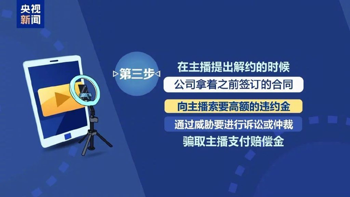 骗局的最后一步是在主播提出解约的时候,公司拿着之前签订的合同,向主播索要高额的违约金,通过威胁要进行诉讼或仲裁,骗取主播支付赔偿金。