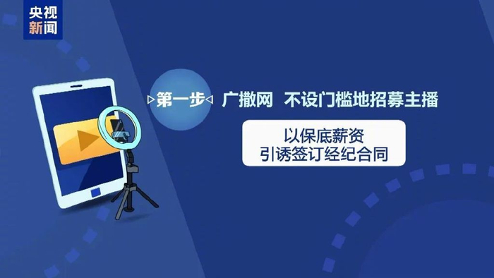 骗局总共分三步,第一步:广撒网、不设门槛地招募主播,以保底薪资引诱签订经纪合同。