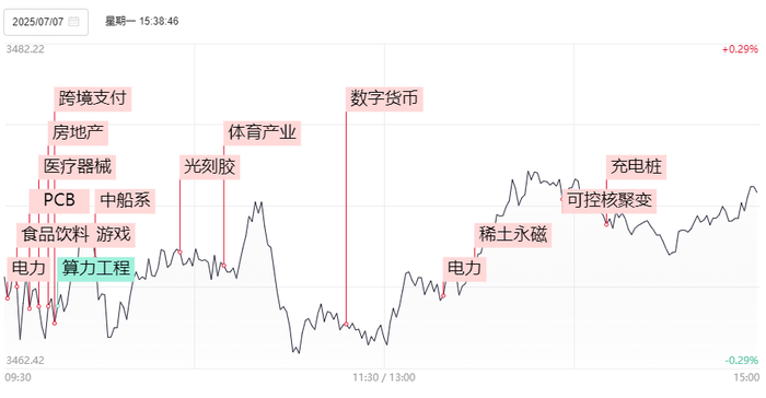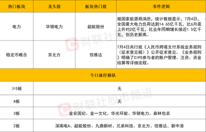 三大指数全天缩量调整,收盘涨跌不一。截至收盘,沪指微涨0.02%,深证成指跌0.70%,创业板指跌1.21%。两市个股涨多跌少,上涨个股超3200只;两市全天成交1.21万亿元,较上一日缩量成交2199亿元,内资主力资金净卖出178.6亿元;两市涨跌中位数为0.36%。盘面上,上证50、创业板50成分股砸盘,题材概念多数反弹。中船系概念股全天领涨两市,中船汉光20CM涨停;电力、虚拟电厂、电网设备等概念午后全线爆发,华银电力、乐山电力等多股涨停;房地产产业链集体反弹,渝开发、沙河股份等涨停;跨境支付、多元金融等大金融概念持续走强,中亦科技、信雅达等多股涨停;足球概念反弹,共创草坪等涨停;银行板块持续强势,板块指数再刷历史新高!农业、稀土、国企改革、周期概念等集体强势。跌幅方面,部分高位股杀跌,诚邦股份跌停,雪迪龙、亿晶光电逼近跌停;CRO、减肥药、创新药等医药概念集体回调,科兴制药跌超10%;光模块、英伟达概念、铜缆高速连接等英伟达产业链集体下行;人形机器人概念持续走低,新华锦跌停;消费电子、苹果概念回调;半导体、光刻机、Chiplet等硬科技概念集体弱势;汽车零部件、一体化压铸、毫米波雷达等汽车产业链全线下行。消息面上,1、全国用电负荷超14亿千瓦,创历史新高;2、四部门发布通知提出,到2027年底力争全国范围内大功率充电设施超过10万台,适度超前进行电网建设并及时升级改造;3、央行就《人民币跨境支付系统业务规则(征求意见稿)》公开征求意见;4、程序化交易新规今日正式实施;5、经济日报刊文称,要加强对“好房子”项目的保障力度;6、美国总统特朗普签署“大而美”税收和支出法案;7、特朗普最新发帖,任何与金砖国家反美政策结盟的国家,关税再加10%。